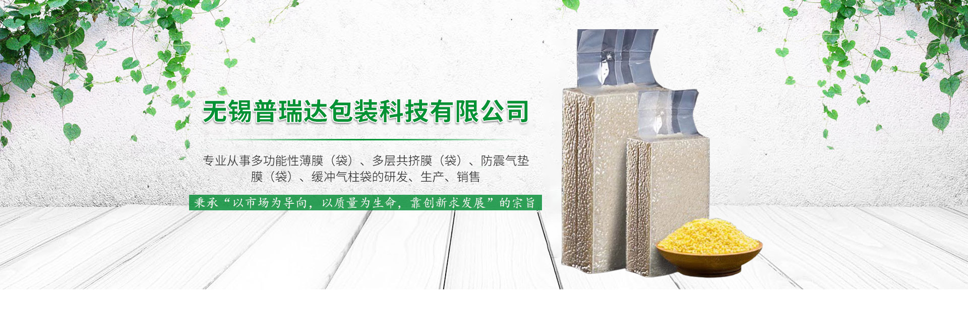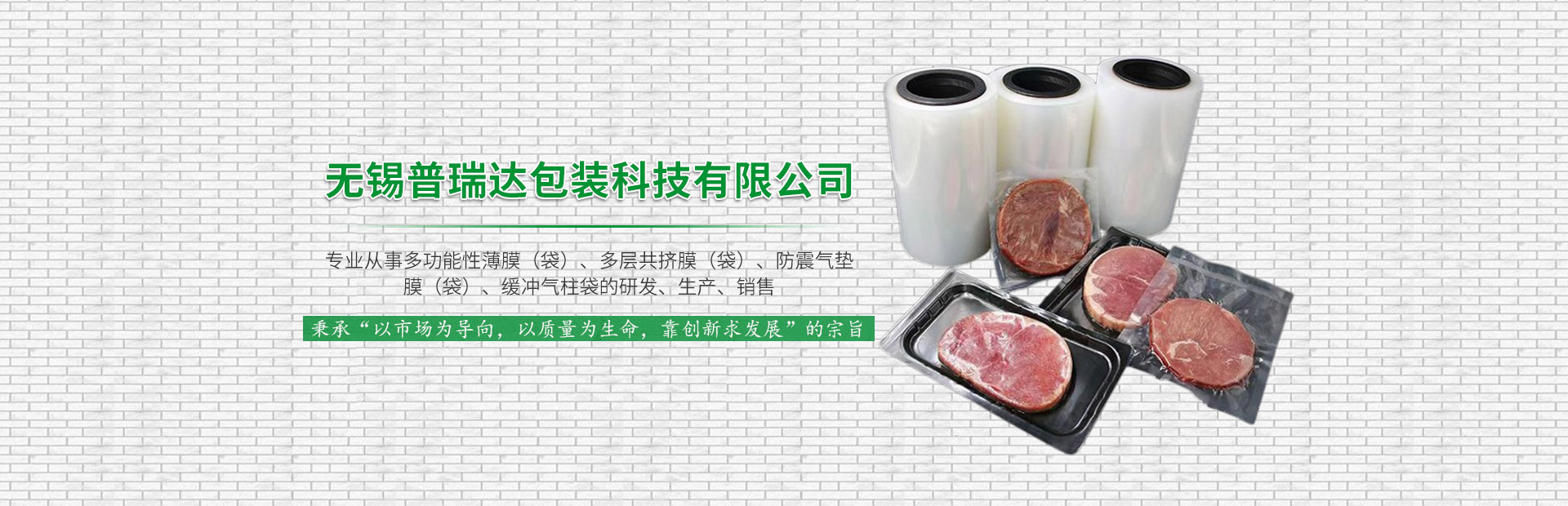 无锡普瑞达包装科技有限公司专业从事多功能性薄膜(袋)、多层共挤膜(袋)、防震气垫膜(袋)、缓冲气柱袋的研发、生产、销售以及售后服务,公司拥有全进口自动化生产线,为用户提供高品质薄膜、各类包装袋、气柱袋等包装材料,规格齐全。我们运用技术为商品包装流通提供了优良合理的包装整体方案及完美贴合的保护,同时降低了用户单位成本并符合绿色环保。产品广泛运用于食品、化工、医疗、日化、电子、物流、建筑等领域。 公司一直致力于包装材料的研究与开发,公司拥有多条专业的生产设备,有自己的研发与设计团队,设有质量部,销售精英团队及良好的售后服务部。 公司不断引进国际技术和设备,提高生产效率和产品质量,以强大的生产能力及精细化生产管理为客户提供包装整体解决方案。 公司通过了ISO9001质量管理体系认证, 公